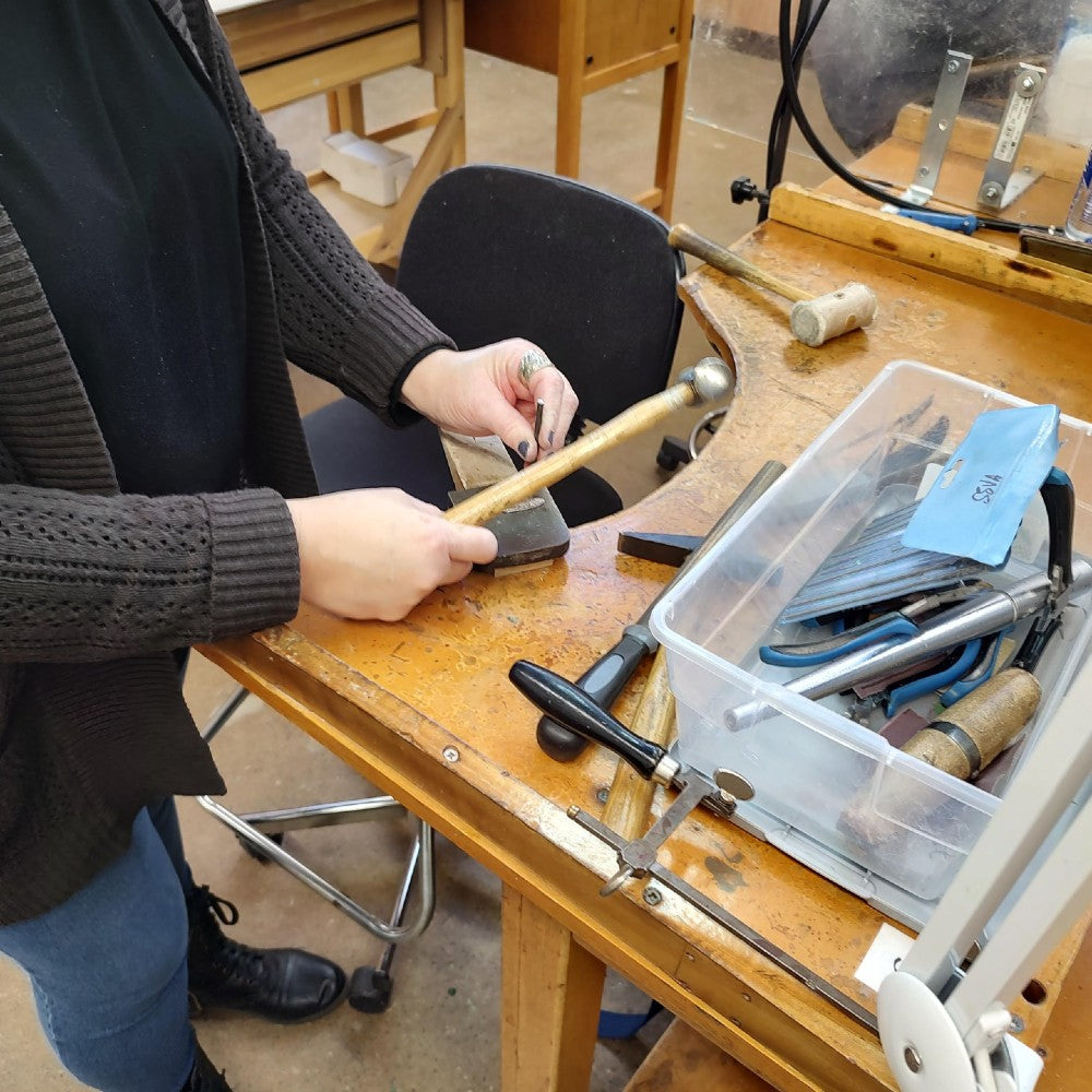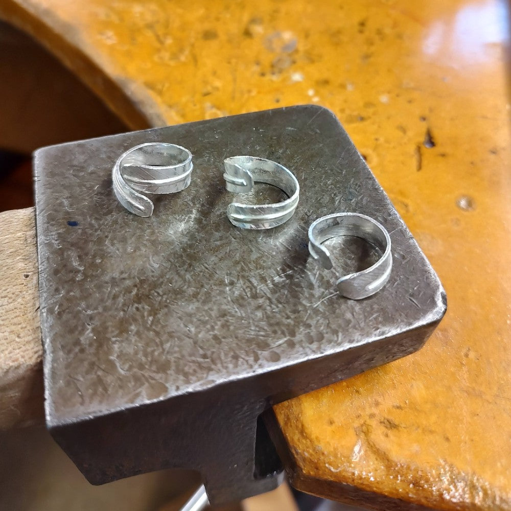 Learn how to make hammered stackable rings out of silver, copper, or brass! Learn skills such as ring sizing, sawing, filing, soldering, and hammer texturing. Beginners and advanced alike are welcome in this simple, fun workshop. Make separate bands, or solder then together, the possibilities are endless!