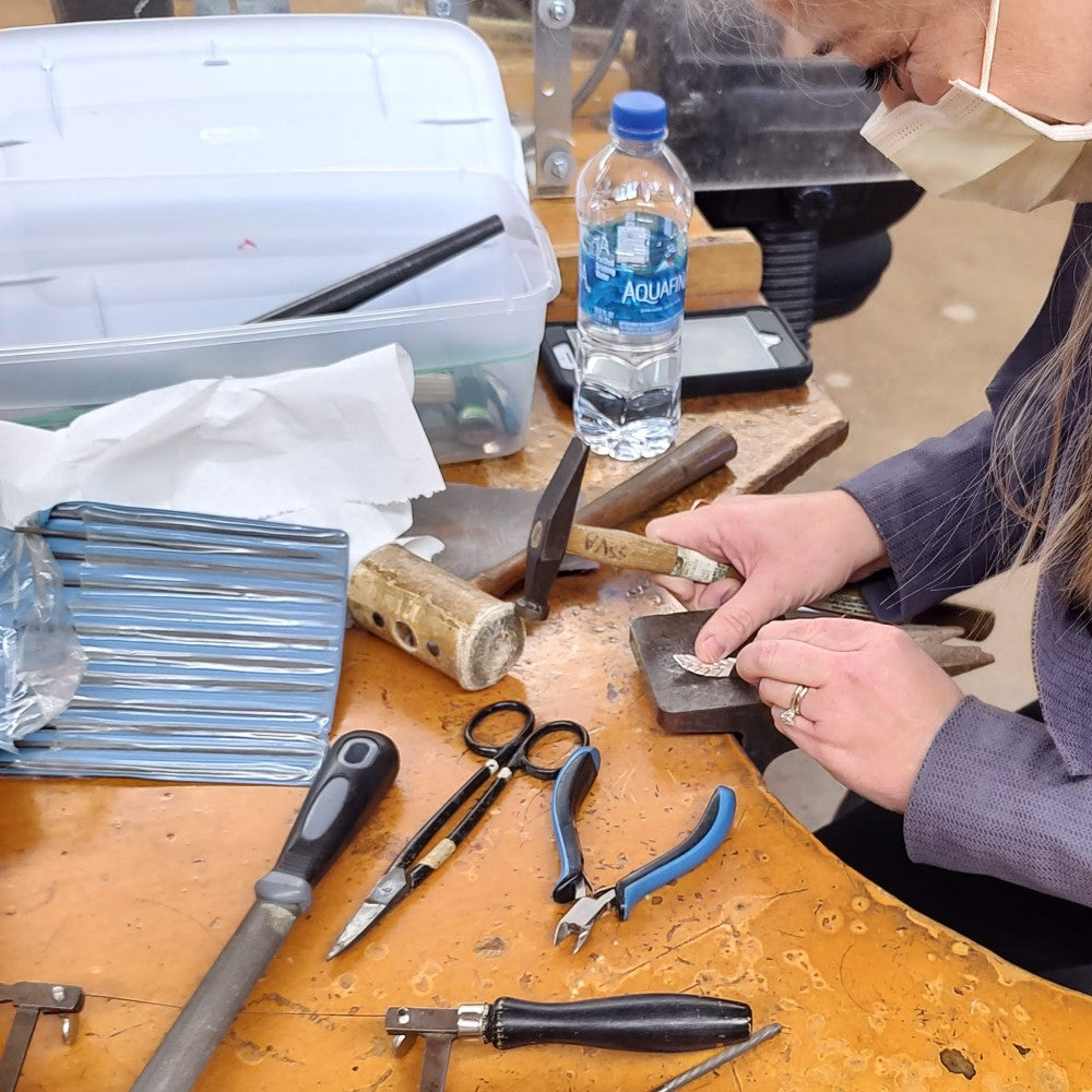 I’ve had a passion for teaching since my college days and have had the immense pleasure of teaching metalsmithing and jewelry workshops since 2013. I’ve taught at both private and public institutions with students of all ages. In my workshops I share my years of artistic knowledge and experience with each student I encounter. I teach a range of skills for beginners to advanced using precious and non-precious metals and materials: Fabrication, forming, hand piercing, and studio set-up and tools, just to name a few.